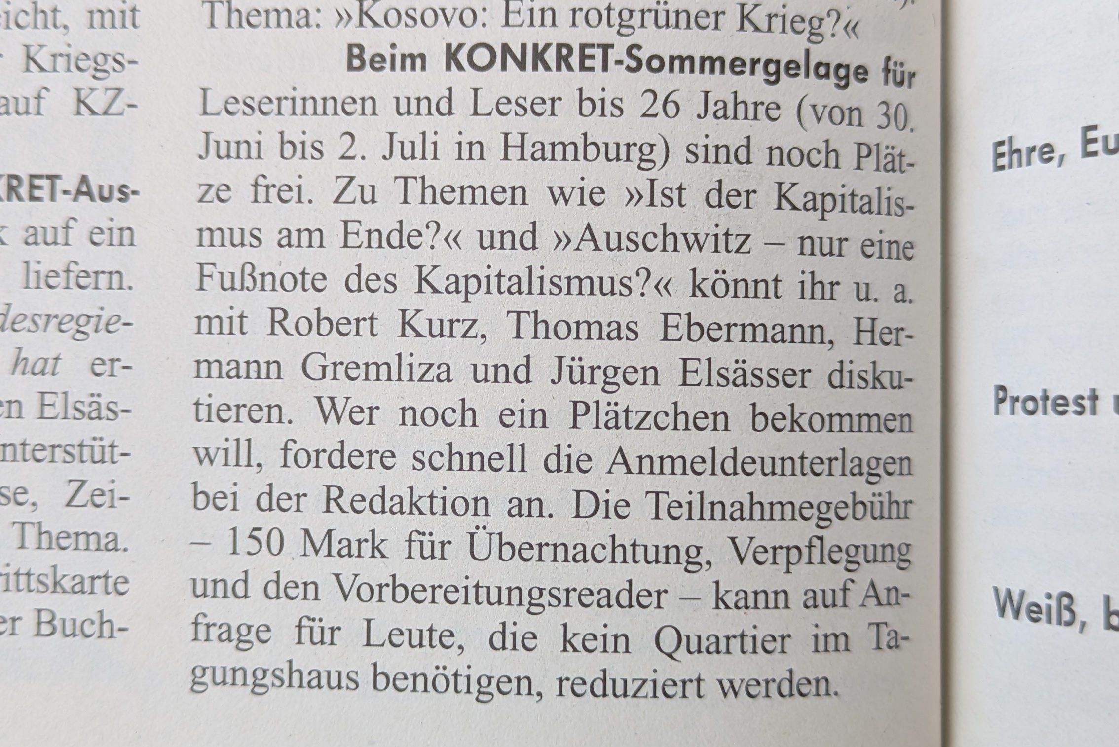 Hurra, es »sind noch Plätze frei.« War das Gelage laut konkret 4/2000 noch halb leer schon halb voll, gibt man sich in dieser Ausgabe mysteriös-unspezifischer. Jetzt aber schnell die Anmeldeunterlagen angefordert! Wer diesen Monat keine Hundertfuffzich Mark mehr über hat, hoffe, dass 6/2000 »noch Plätze frei« sind.