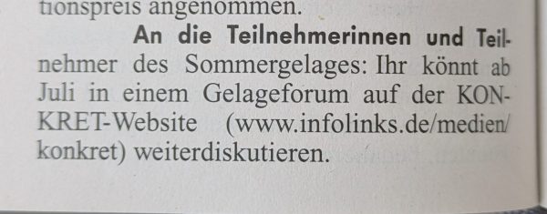 Hurra, es »sind noch Plätze frei.« War das Gelage laut konkret 4/2000noch halb leer schon halb voll, gibt man sich in dieser Ausgabe mysteriös-unspezifischer. Jetzt aber schnell die Anmeldeunterlagen angefordert! Wer diesen Monat keine Hundertfuffzich Mark mehr über hat, hoffe, dass 6/2000 »noch Plätze frei« sind.