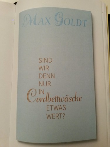 Auf Max Goldts Frage »Sind wir denn nur in Cordbettwäsche etwas wert?« würde ich – obschon sie rhetorisch und nur Buchtitel ist – antworten: »Ja, aber nur fast. Empor in die elysischen Gefilde reiner Güte höbe uns Cordbettwäsche nur in Verbindung mit einem Cordschlafanzug! Denn mit dessen Rillen könnte man im Bett schön in der Bettwäsche ›einrasten‹ und hätte nächtens bzw. schlafenszeitens seine sel’ge Ruh’. Außerdem wären Cordbettwäsche wie -schlafanzug das, was dieser Tage von Comfort im allgemeinen erfüllt werden sollte: fördernd und fordernd. In ihrer doch nicht zu weichen Gemütlichkeit, ja gutmütig-omahaften Widerborstigkeit gemahnten sie eins stets auch an die harten Untergründe des Lebens und entließen nicht in die umstandslos ticketartig eingeforderte Weichlichkeit, die sozialen Verhältnissen am Ende des Tages nur zum Nachteil gereichen. Cord tragen ist immer auch Cord ertragen.«