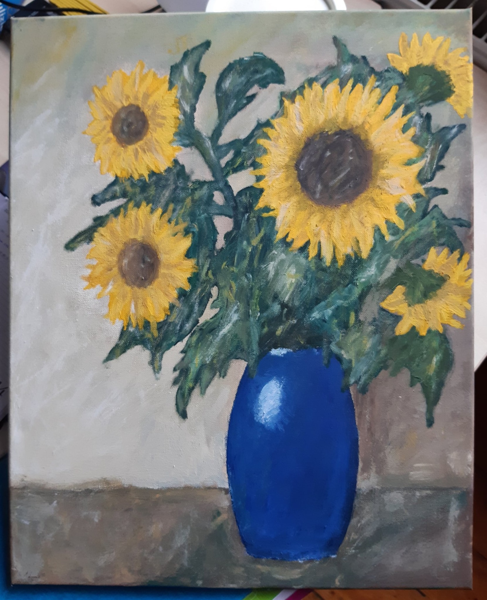 Die beiden Blumen rechts schauen absichtlich von den Betrachtenden weg, damit es was zum Interpretieren gibt. Bislang interpretierte noch niemand. Es kann auch sein, dass auf dem Bild, das als Abmalvorlage gedient hatte, auch zwei Blumen so weggeschaut hatten. Trotzdem interpretabel imho