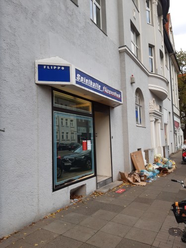 Leider nicht mehr geöffnet: Spielhalle flippothek, von sich selbst auch genannt FLIPPO. Wie schade! »Ich geh noch in die Flippo!«, »Wo ich spiel, das ist doch klippo: Nirgends außer in der Flippo!«, »Morgens brauch ich nur Kaffee, Klo und Flippo« oder »Hallo, bin ich bei der Flipo? Hier Grobhans von der Kripo…« – all sowas, bedauerlicherweise nicht mehr möglich.
