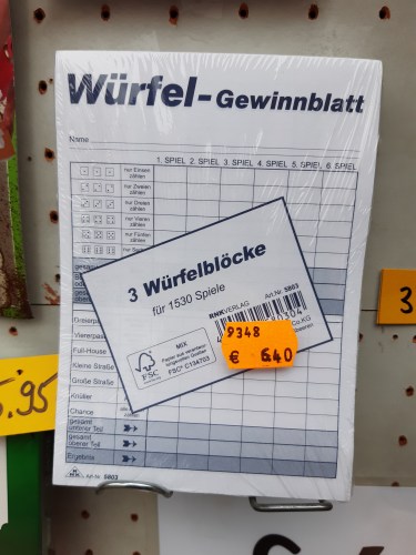 »Würfel-Gewinnblatt« 9. Mai 202113. August 2022 ~ Andreas Maria Lugauer Hallo, kennt’s ihr nicht auch das berühmte »Würfel-Gewinnblatt« – wenn man fünf gleiche Augenzahlen würfelt, hat man einen sogenannten »Knüller« Teilen mit: Klicke, um auf X zu teilen (Wird in neuem Fenster geöffnet) X Klick, um auf Facebook zu teilen (Wird in neuem Fenster geöffnet) Facebook Klicken, um auf Telegram zu teilen (Wird in neuem Fenster geöffnet) Telegram Klicken, um auf WhatsApp zu teilen (Wird in neuem Fenster geöffnet) WhatsApp Klicken, um einem Freund einen Link per E-Mail zu senden (Wird in neuem Fenster geöffnet) E-Mail Klicken zum Ausdrucken (Wird in neuem Fenster geöffnet) Drucken Gefällt mir Wird geladen … Ähnliche Beiträge