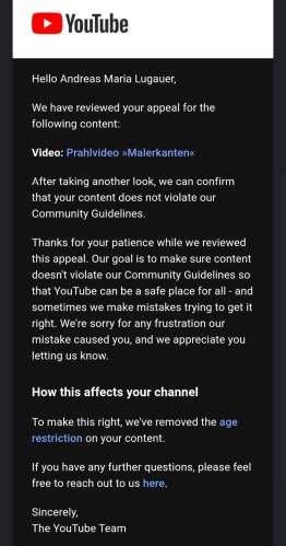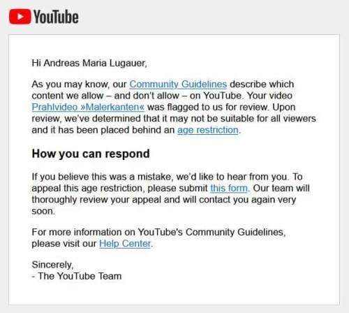 23.05.2021 | Na servus: Ein Video, in dem ich schamlos mit den Malerkanten in unserer Küche herumprahle, wurde von irgendwem gemeldet und daraufhin von der Fa. YouTube mit der Altersfreigabe »ab 18« versehen. Wahrscheinlich, weil die Kanten einfach zu scharf sind und das Video deswegen too sexy?!