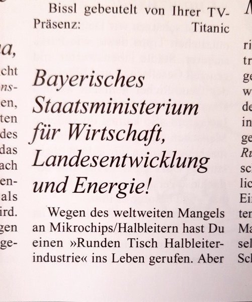 In TITANIC 11/21 – seit gestern am Kiosk! – schreibe ich einen »Brief an die Leser*innen« im Aiwanger-Ministerium und einen »Fachmann«-Text über Smartphonevibrationen:
