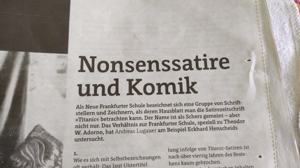 In der aktuellen Ausgabe der Jungle World: Mein Text über Eckhard Henscheid und Adorno, »Nonsenssatire und Komik« (Jungle-World-Feuilleton-Beilage Dschungel 12/2022, S. 18–23; für Online-Abonnent*innen hier).