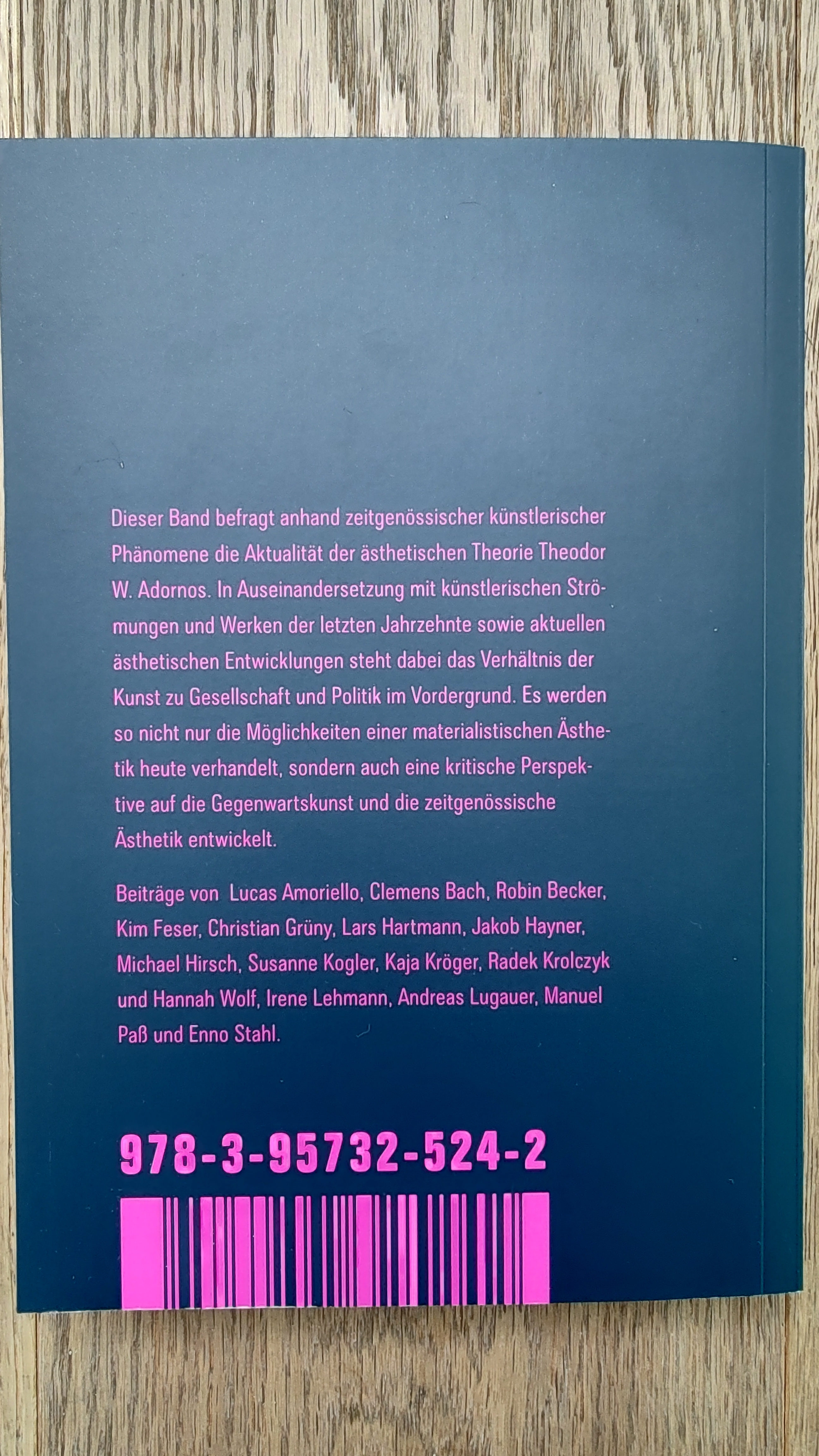 Dabei handelt es sich um einen Komplettabdruck des Textes, der kürzlich im Sammelband Ästhetik nach Adorno. Positionen zur Gegenwartskunst (Robin Becker, David Hagen und Livia von Samson (Hrsg.), Berlin: Verbrecher Verlag 2022) erschien.