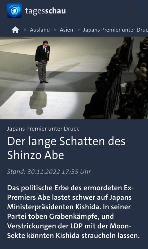 Meine Güte, wie lange muss in der armen Bildredaktion von tagesschau.de jemand nach einem Foto von Shinzō Abe (eigentlich: Abe Shinzō) mit langem Schatten gesucht haben? Um dann nur eins zu finden, dem doch wieder jemand den Vorwurf der Text-Bild-Schere machen kann?