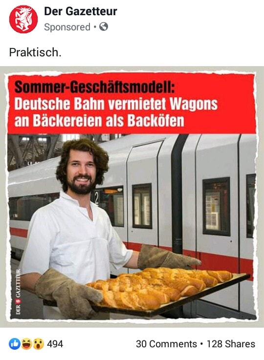 »Als Backöfen: Deutsche Bahn vermietet Waggons an Bäckereien« – dergestalt wäre diese als »Witz« missverstandene bloße Postillonesque immerhin nicht so unangenehm ungelenk geschrieben.