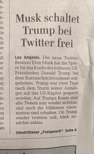 Und was soll ich sagen: Was Möchtegern-Memelord Musk mit Faschisten-Trumps Twitteraccount gemacht hatte, ist eben kein »Umstrittener ›Freispruch‹«. Es ist vielmehr, wenn man schon auf das depperte umstritten nicht verzichten will kann und aus der Accountsperre bildlich unbedingt eine Strafe im juristischen Sinne machen muss, eine »Umstrittene ›Begnadigung‹«. Trump hatte sich ja nicht in einem laufenden Prozess befunden, dessen Urteil noch ausgestanden hätte. Und es hatte, um uns weiters in den juristischen Bildbereich zu zwingen, keine Revision stattgefunden, sondern MMM hatte eine Twitterumfrage zur Entsperrung des Accounts gemacht, die mit ca. 52:48 % Ja-Stimmen etwas deutlicher ausgefallen war als die gewöhnliche Präsidentschaftswahlenzitterpartie in dem so »tief gespaltenen Land« (HAZ, möchte wetten).