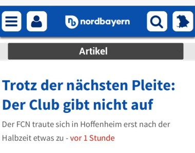 nordbayern.de über den 1. FC Nürnberg (aktuell letzter Tabellenplatz, die letzten 18 von 25 Spielen keines gewonnen, müsste ab jetzt ungefähr jedes der kommenden neun Spiele gewinnen; steigt heuer zu praktisch 💯% wieder ab): »Trotz der nächsten Pleite: Der Club gibt nicht auf«.