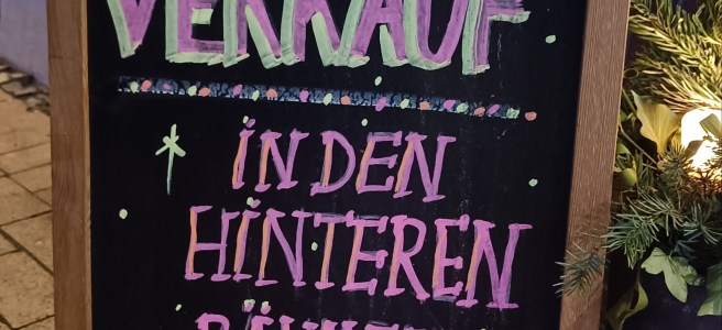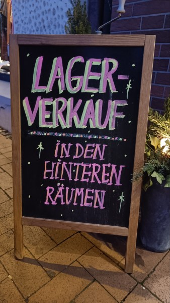 Verleser des Tages (I) 14. Dezember 202214. Dezember 2022 ~ Andreas Maria Lugauer ~ Hinterlasse einen Kommentar Im Vorbeigehen gelesen: LAGER-VERKAUFIN DENHINTERNRÄUMEN
